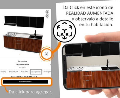 En el configurador, ya para ver mejor tu diseño da click en el Icono de Realidad Aumentada para visuallizar en tu habitación muy a detalle.