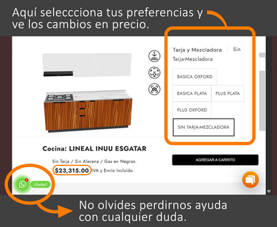 Ya que estas en uno de los modelos, es hora de dejarla a tu gusto!, puedes seleccionar tu tipo de tarja (fregadero) si es que quieres una, y de estufa y campana.